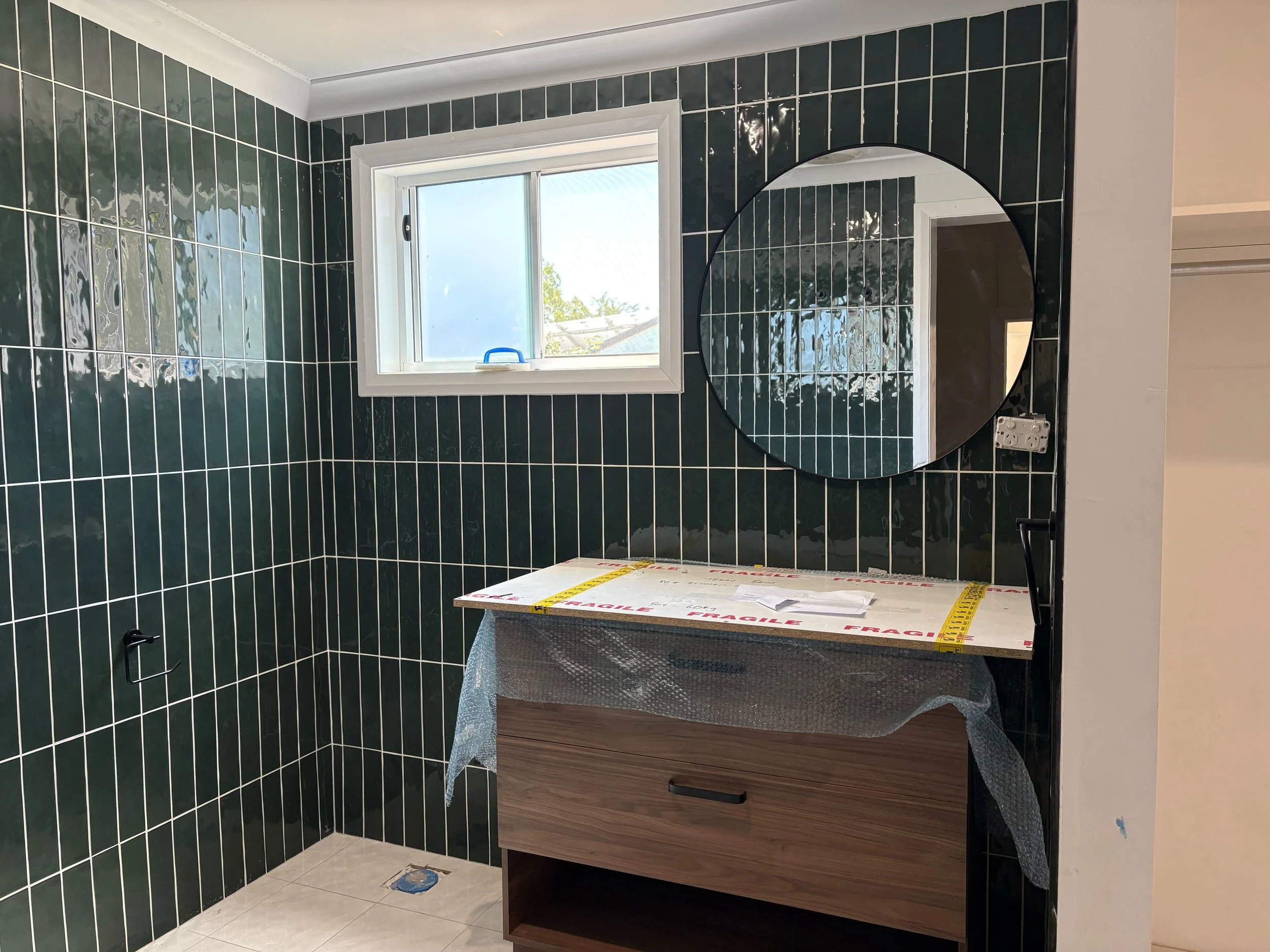 We’re transforming a residential bathroom into a modern, functional space. Our team has completed demolition, wall and floor preparation, full waterproofing, and tiling from floor to ceiling. Fixtures, including the shower screen, vanity, and taps, have been installed, with final touches like a custom drawer and mixer pending. Every step follows strict quality and compliance standards, ensuring a durable and stylish finish for our client.